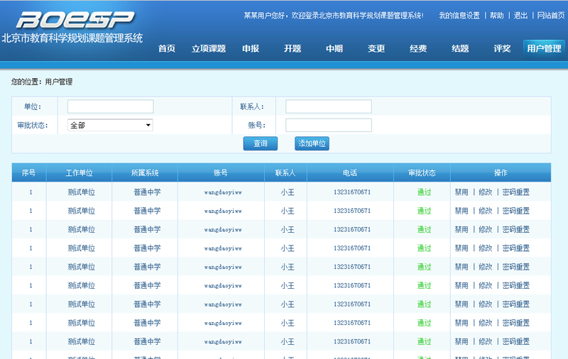 工作单位用户可以通过输入查询条件,点击查询按钮查询指定的用户信息。