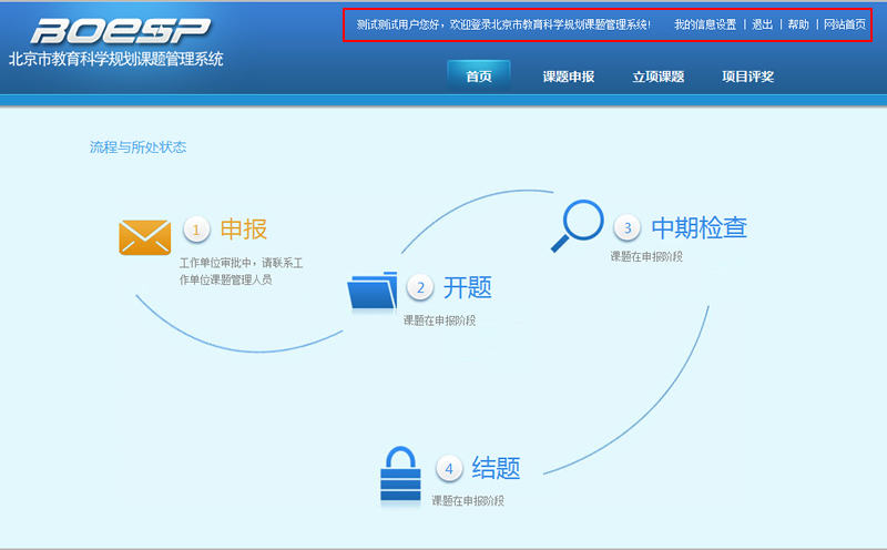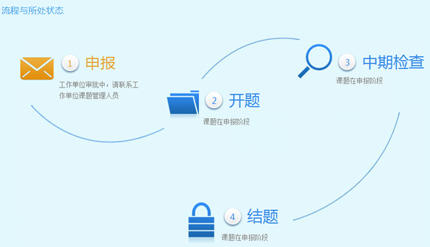 课题个人用户登录系统可以很直观的通过流程与所处状体图反应课题所处的阶段,黄色图标代表你所处的阶段,图标下的注释文字反应你的课题的处理状态。