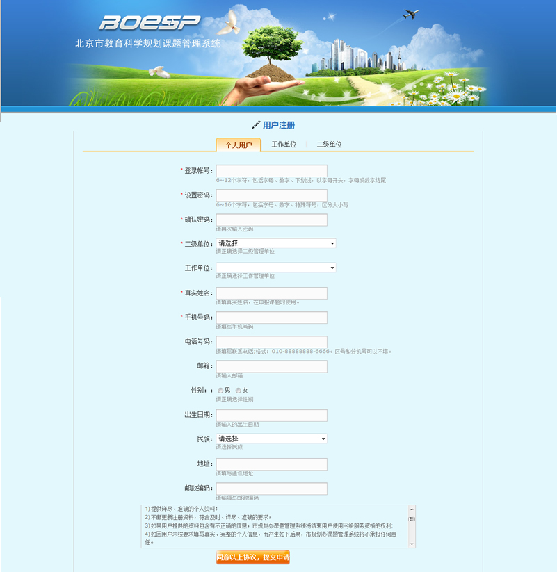 选择个人用户,并根据实际情况填写用户名、密码、受托管理机构、工作单位(如果受托管理机构选择直接管理课题负责人,则该选项下无内容)、真实姓名、手机号码、电话号码、邮箱、性别、出生日期、民族、通信地址、邮政编码。